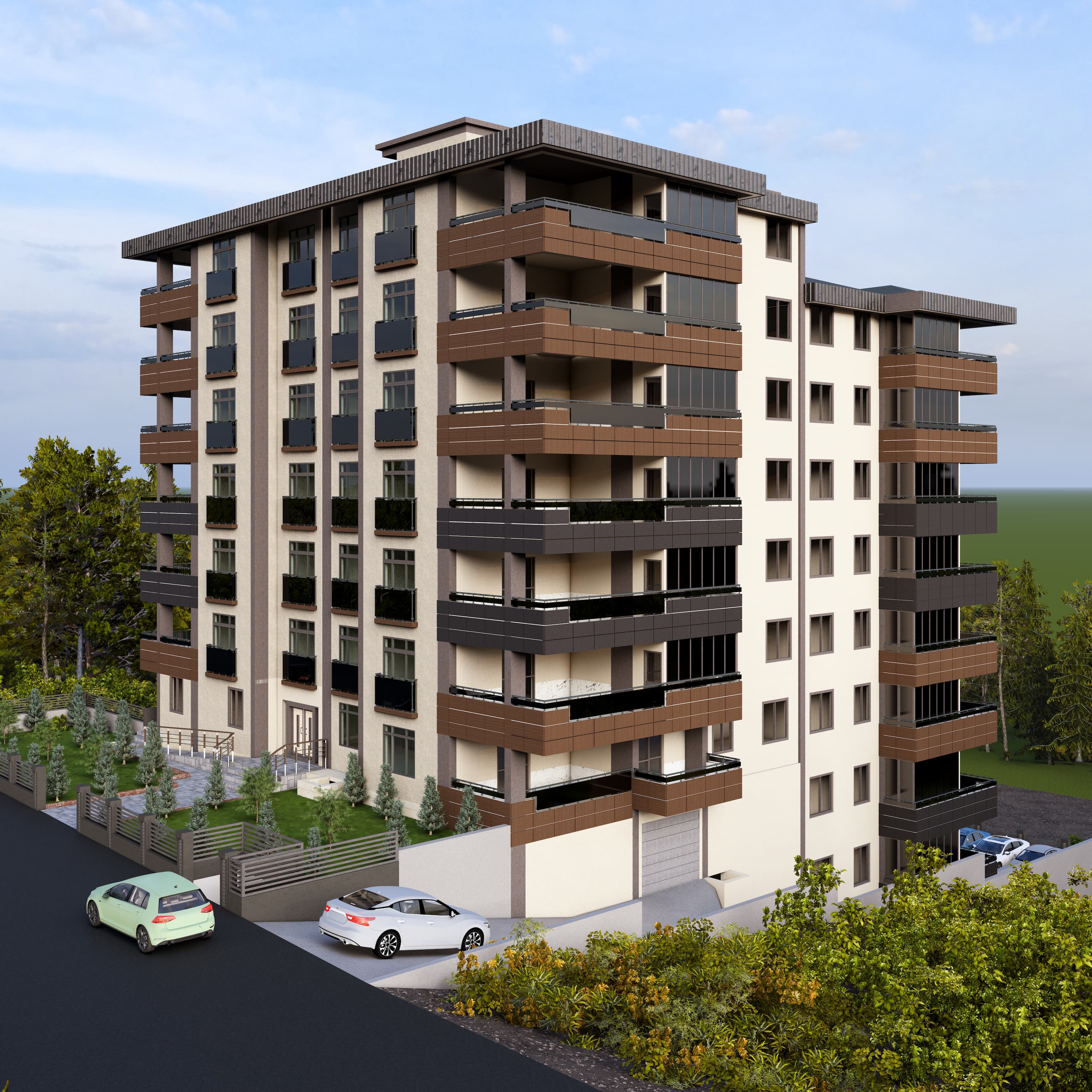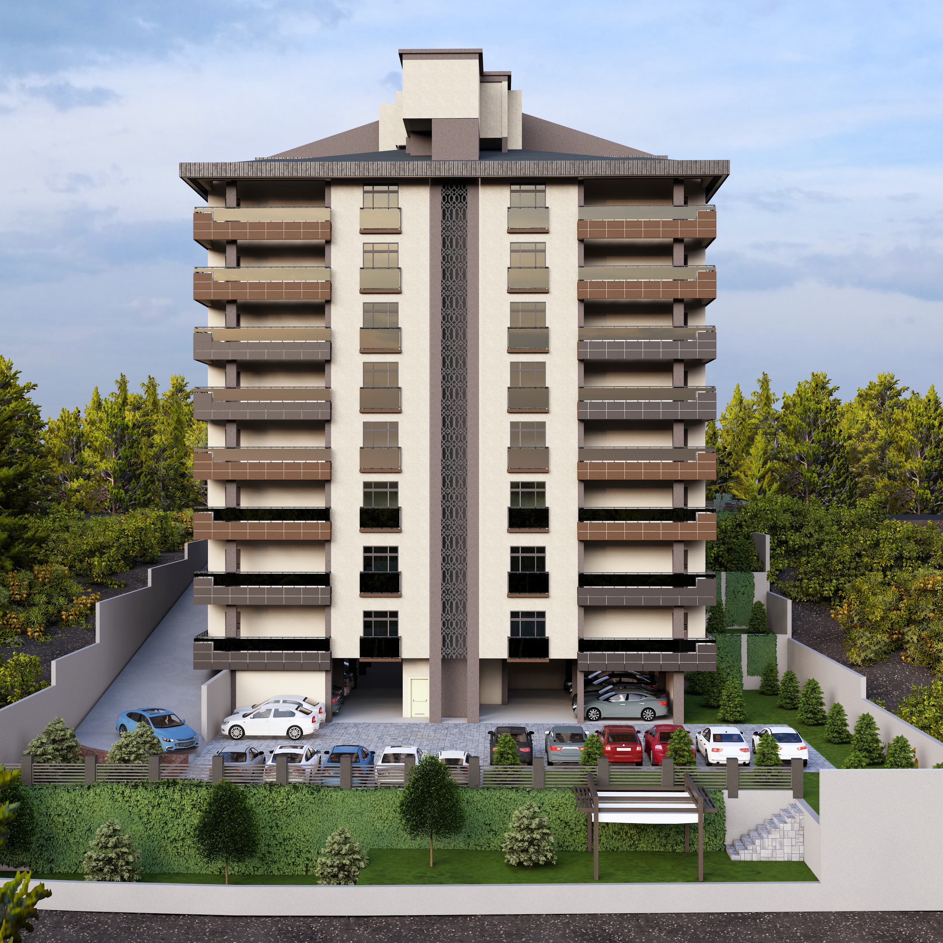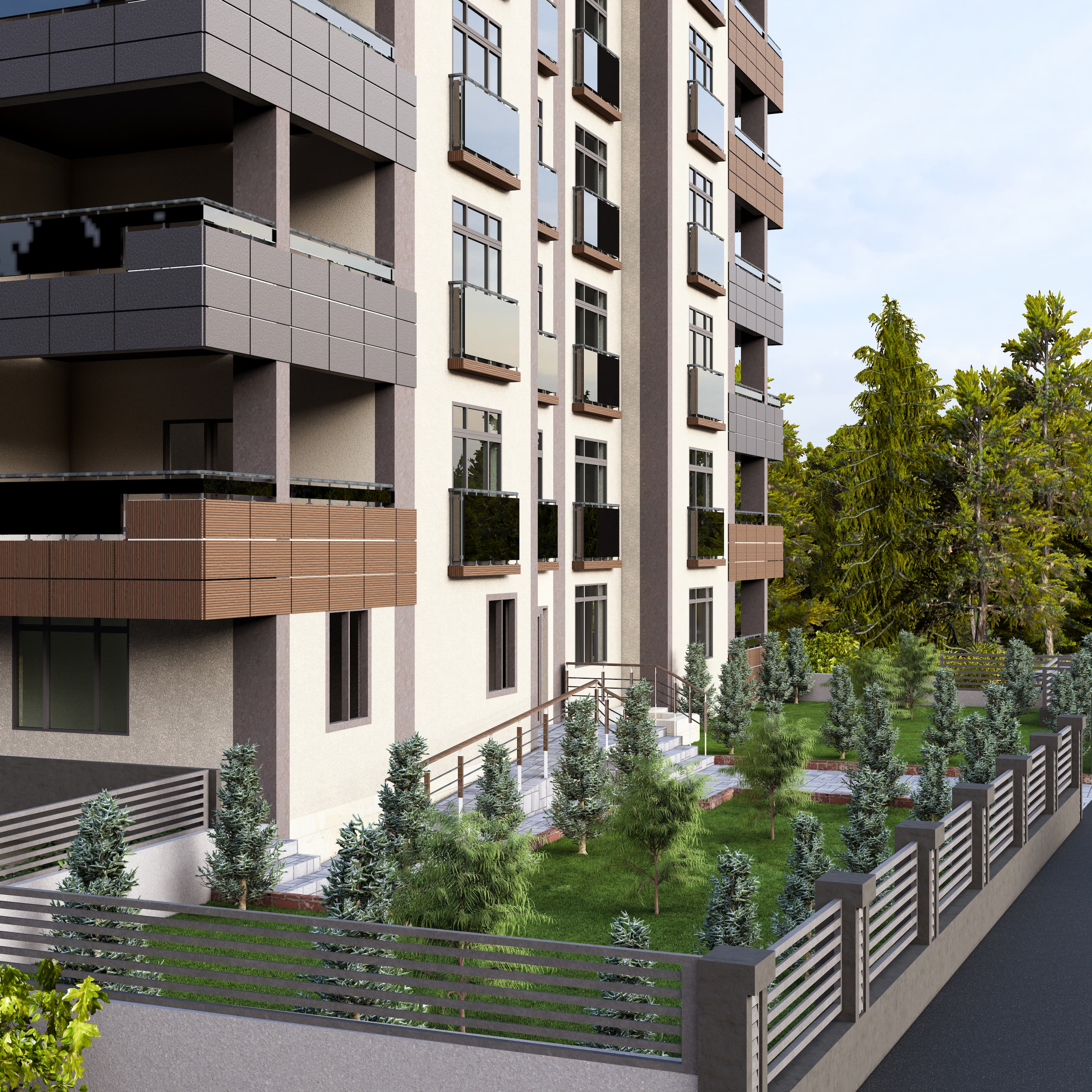 Bölgeye yönelik şartlar dahilinde 60 x 120 Krem, Antrasit , Kahverengi ve tonları seramik kaplama ile birlikte kullanıldı. Kalan kısımlar yine cepheye uygun renkler ile boyandı. Projemiz 2,5+1 & 3,5+1 daireler içermektedir.