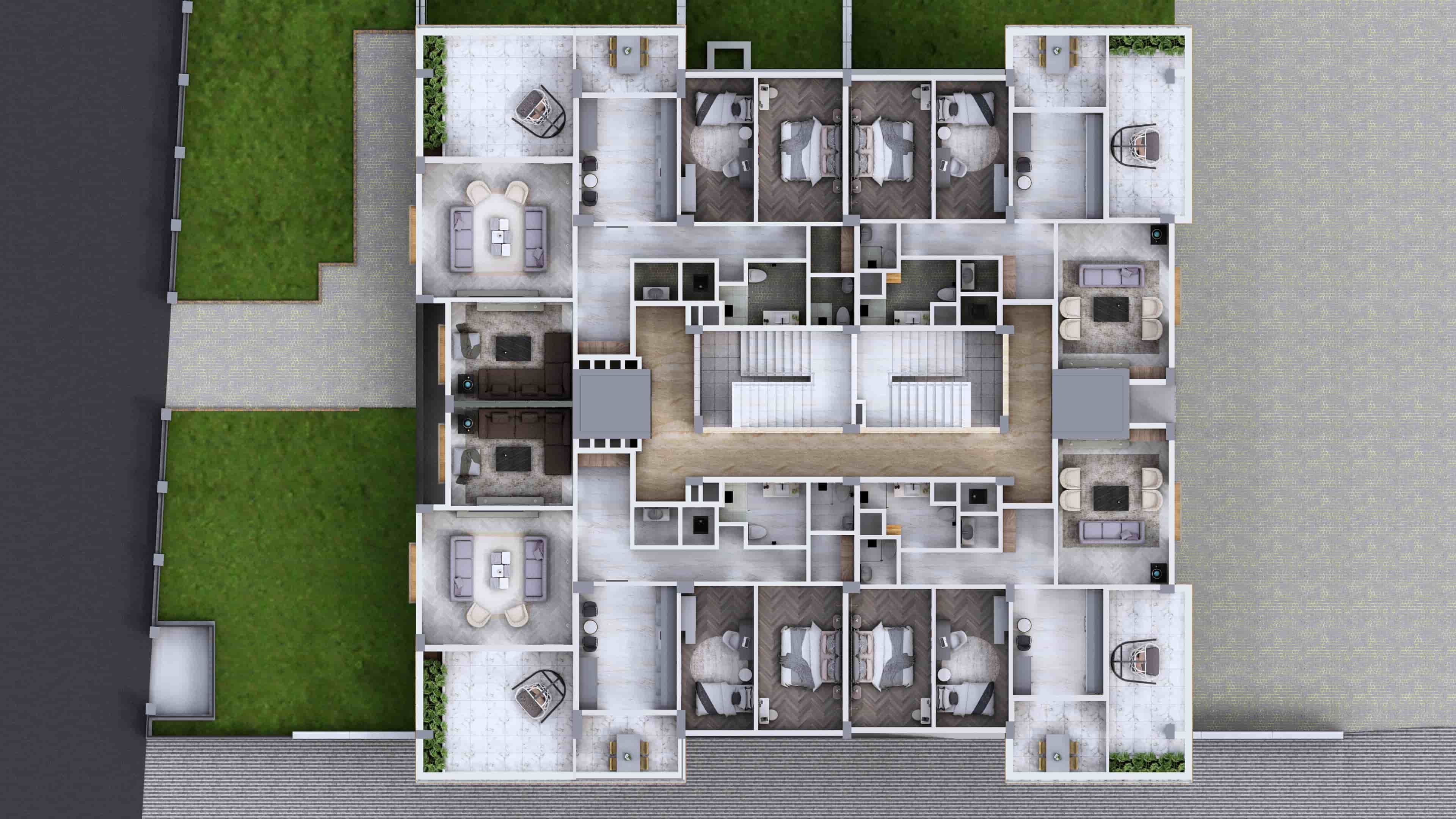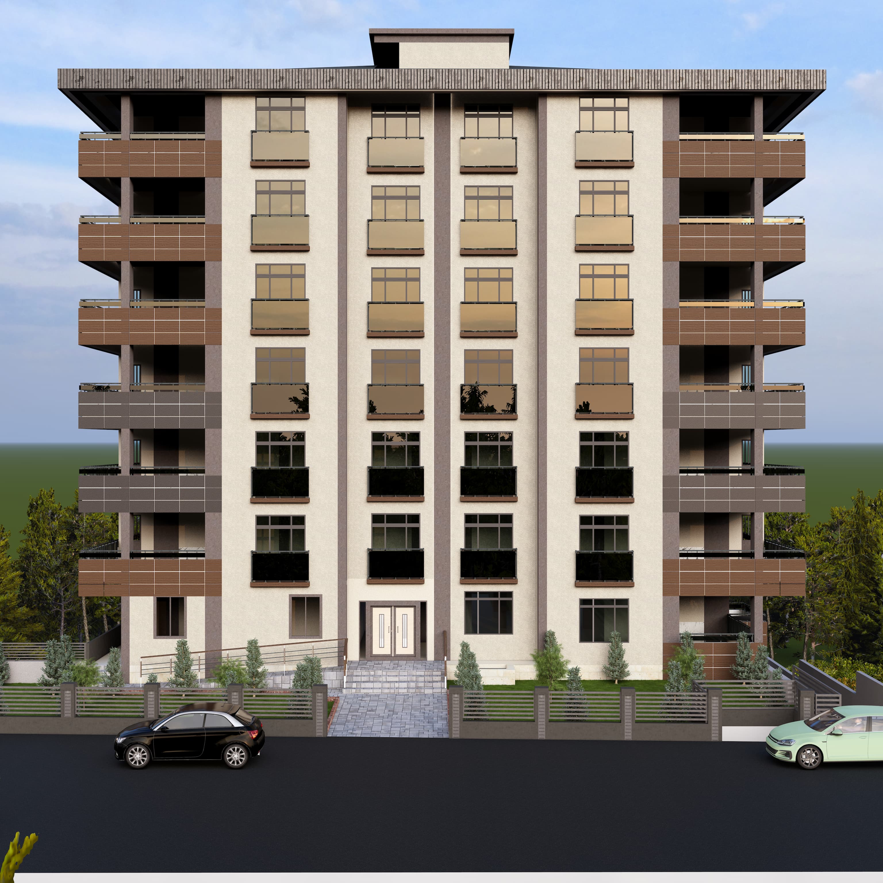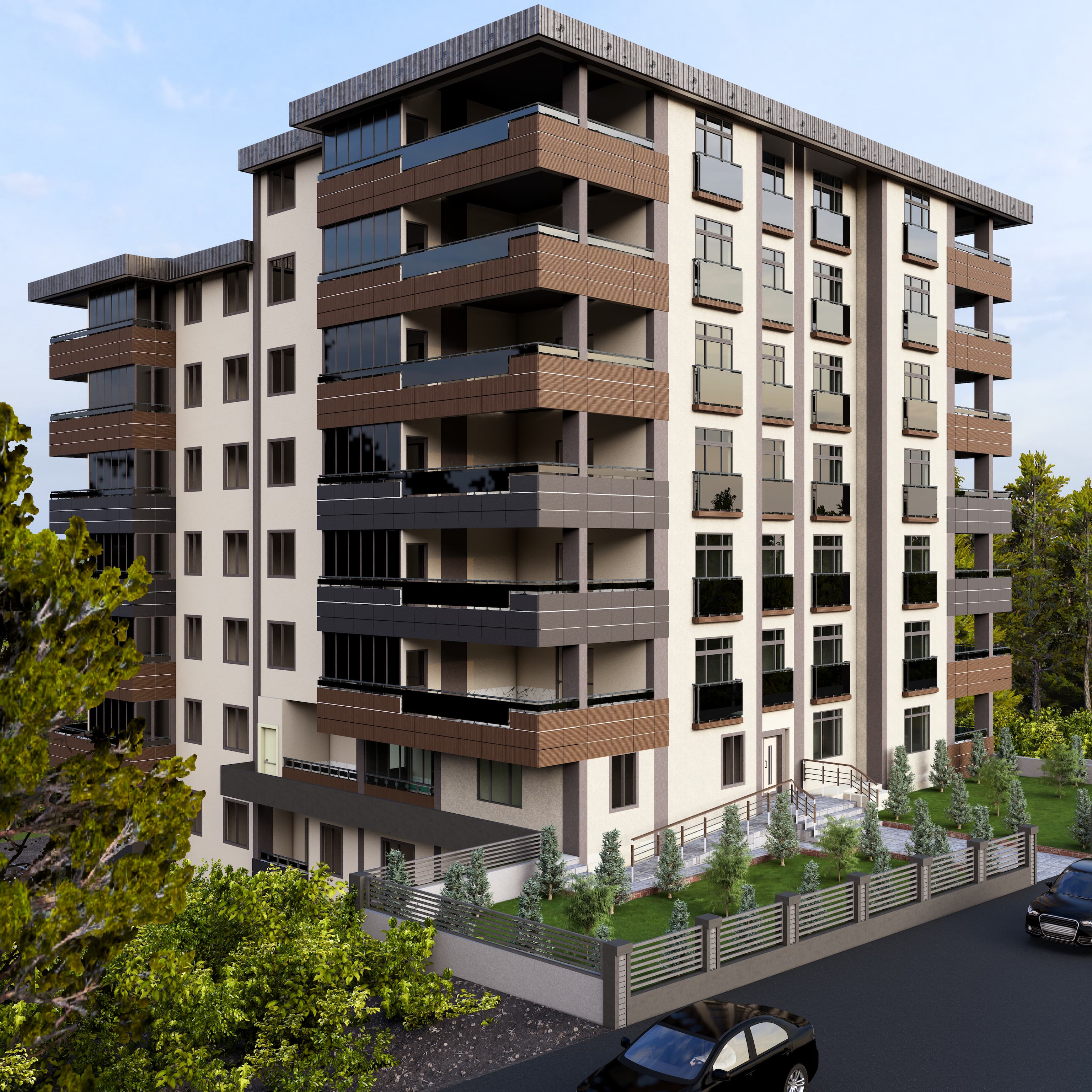 Bölgeye yönelik şartlar dahilinde 60 x 120 Krem, Antrasit , Kahverengi ve tonları seramik kaplama ile birlikte kullanıldı. Kalan kısımlar yine cepheye uygun renkler ile boyandı. Projemiz 2,5+1 & 3,5+1 daireler içermektedir.