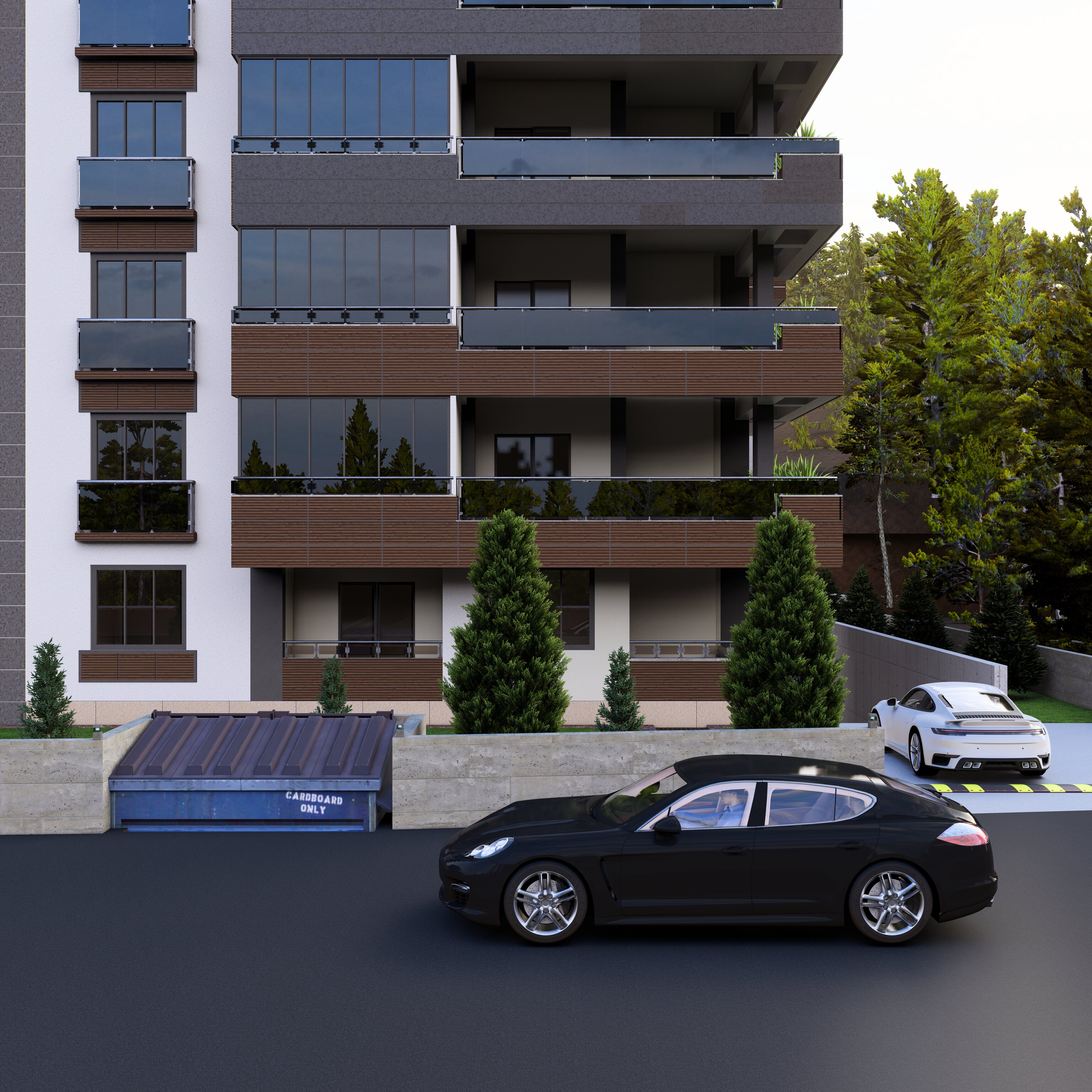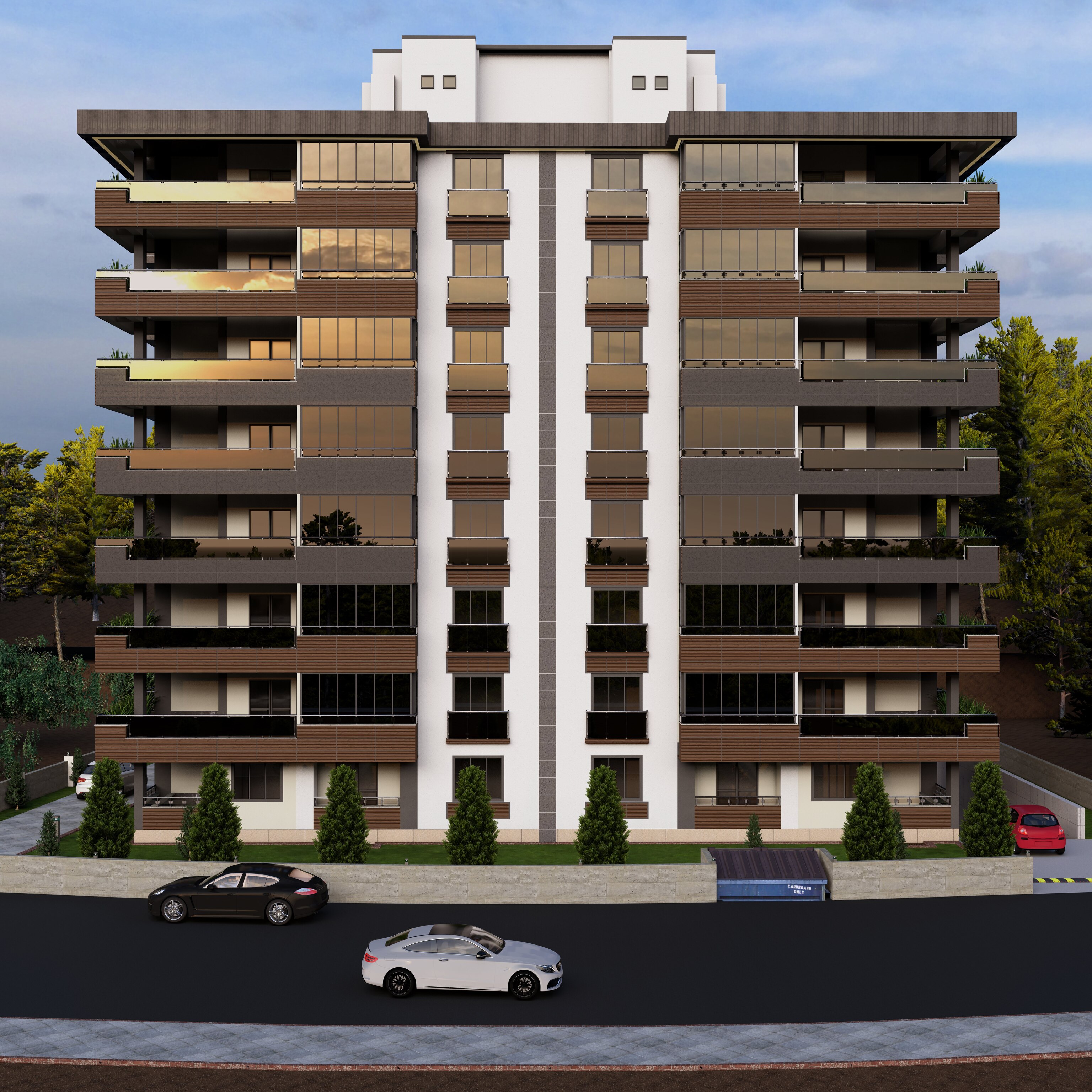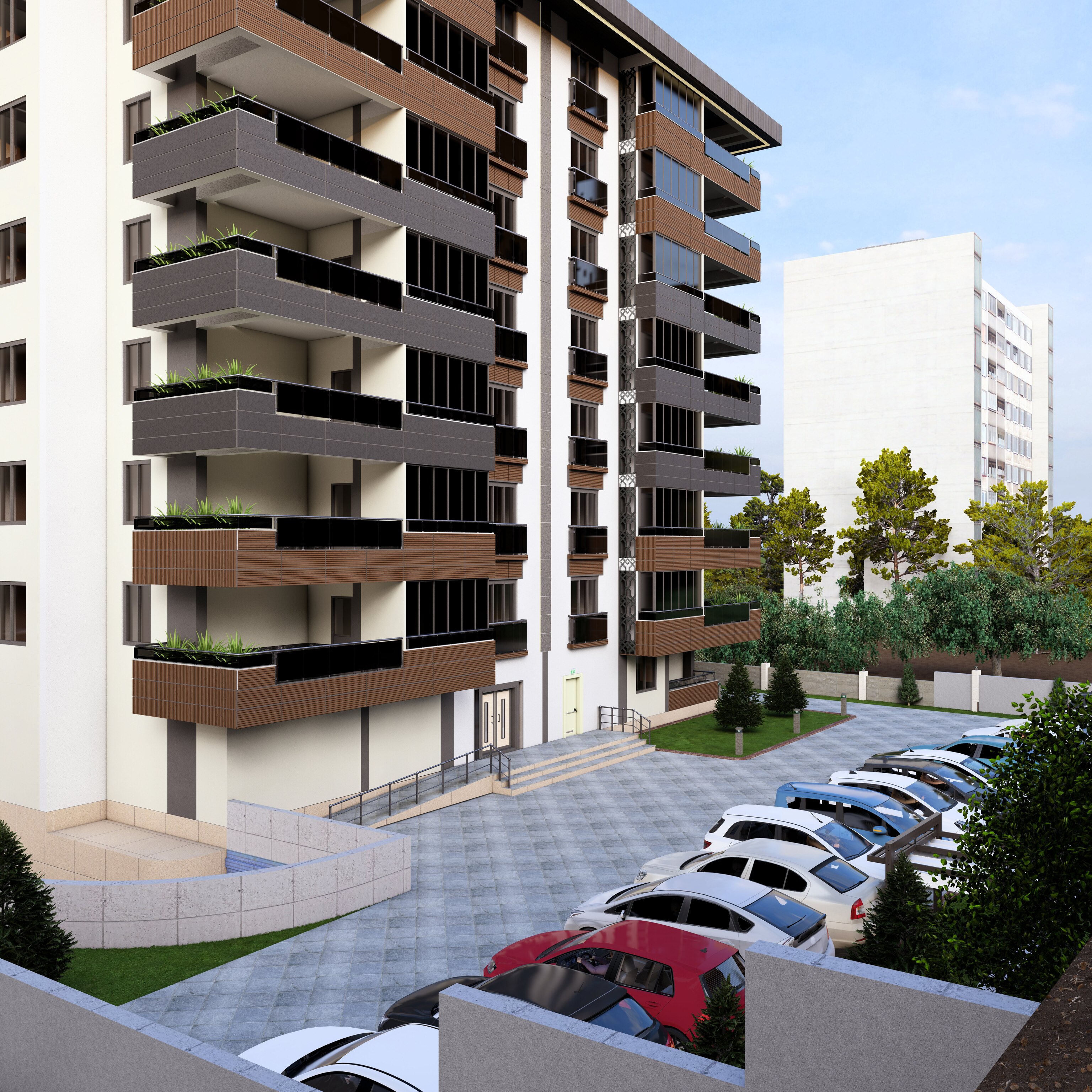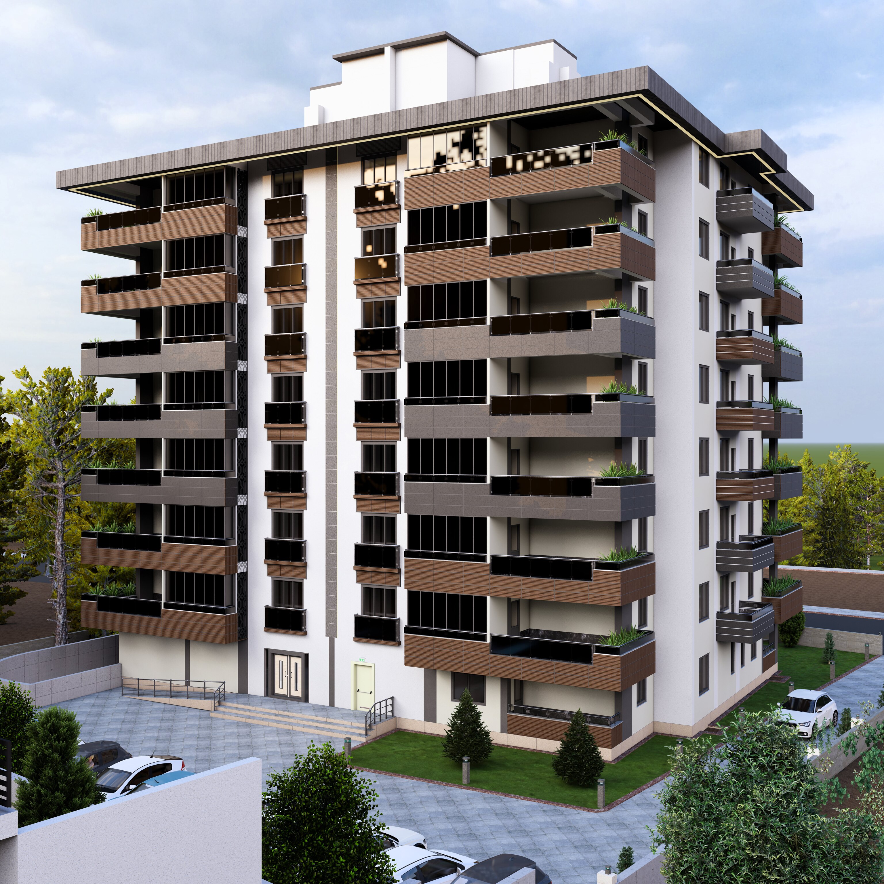 Bölgeye yönelik şartlar dahilinde 60 x 120 Krem, Antrasit , Kahverengi ve tonları seramik kaplama ile birlikte kullanıldı. Kalan kısımlar yine cepheye uygun renkler ile boyandı. Projemiz 2,5+1 & 3,5+1 daireler içermektedir.